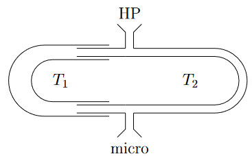 On considère un trombone modélisé par le schéma ci-après. La partie gauche peut coulisser, ralongeant le trajet de l’onde sonore dans cette partie. Un haut-parleur émet un son à une fréquence de \(f = 1.5 kHz\) et un microphone enregistre le signal en sortie. En déplaçant \(T_1\), on fait varier l’amplitude du signal observé qui passe deux fois de suite par une valeur minimale lorsqu’on déplace \(T_1\) de \(d = 11.5cm\)